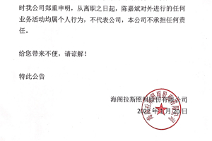 原我公司外贸部业务员苏俊杰于2021年3月8日、吴乐延、雷洁莹于2021年3月15日因个人原因正式离职,感谢他们一直以来对公司的付出与努力。同时我公司郑重申明,从离职之日起,苏俊杰、吴乐延、雷洁莹对外进行的任何业务活动均属个人行为,不代表公司,本公司不承担任何责任。给您带来不便,请谅解!特此公告海阁拉斯照明股份有限公司2021年3月16日